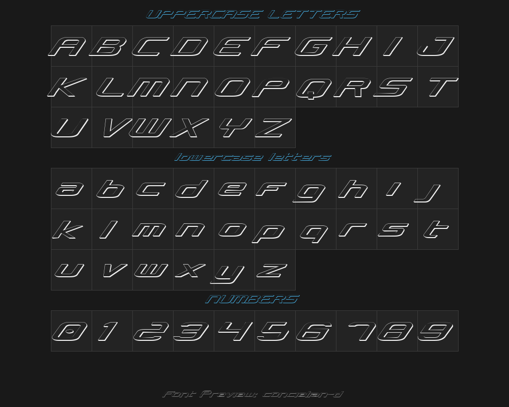 concielian-3d is a font file with a size of 0.07 MB. The full font name is Concielian 3D, Version 2.0; 2003; initial release version. It contains 222 characters, supports 8 Chinese characters. The copyright belongs to Concielian 3D. concielian-3d font is available for free download, but commercial use requires confirmation on the Concielian 3D official website whether it's free for commercial use.